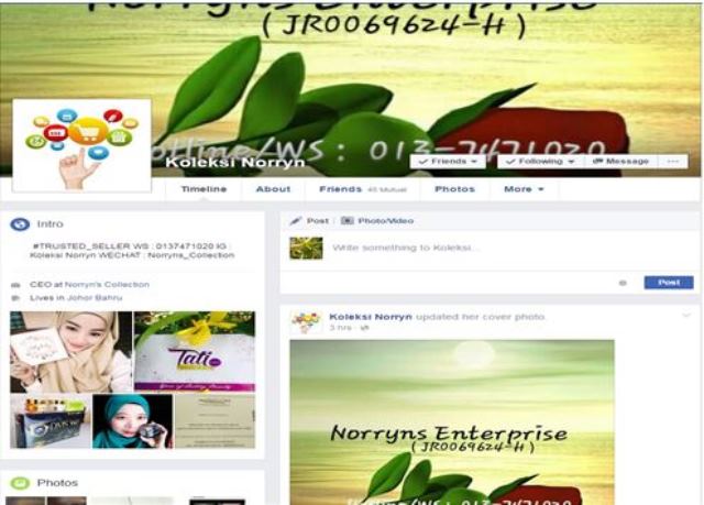 Page facebook yang diusahkan oleh Puan Surinah bagi mempromosikan perniagaan beliau.